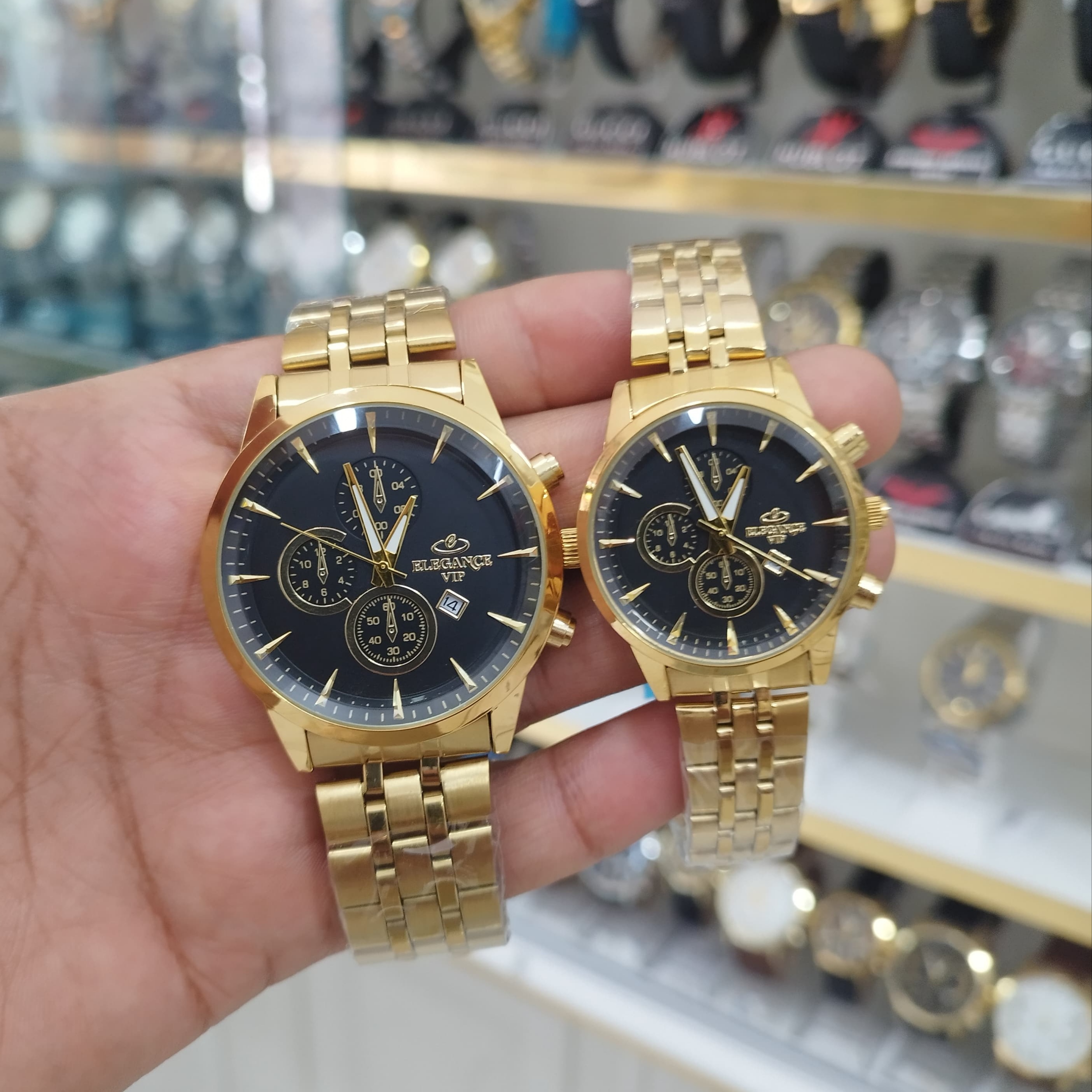 ساعت الگانس vip ست زنانه و مردانه تقویم دار طرح 3 موتور استیل رنگ ثابت ضد آب ارسال رایگان بادوتا جعبه ودوباتری اشانتیون/